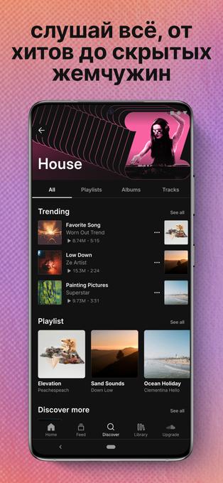 Поиск — это отдельный вид искусства. Ищите по жанру, настроению, инструментам или вообще по атмосфере. Хотите что-то для вечерней пробежки под дождём? SoundCloud найдёт. Нужен саундтрек для ночного программирования? Пожалуйста, вот три плейлиста.