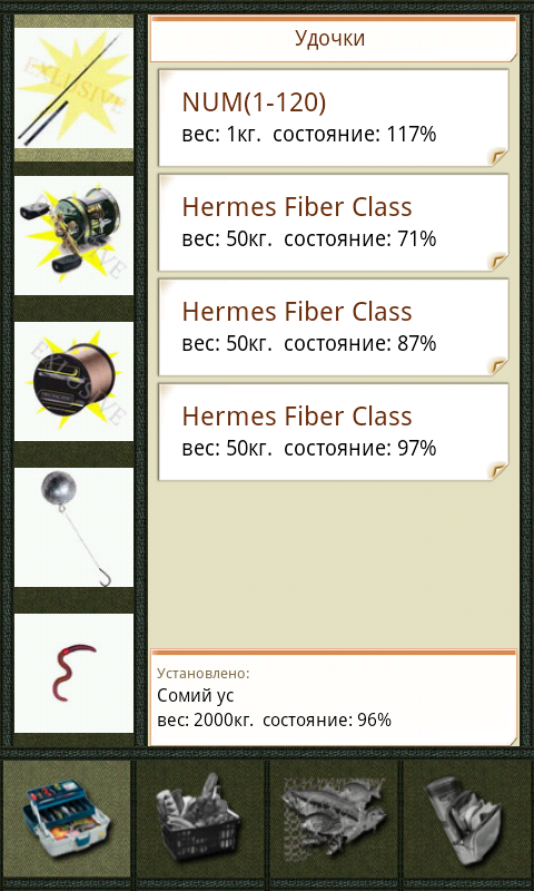 - Прокачивайте навыки рыбака (выносливость, меткость заброса, сила вываживания)