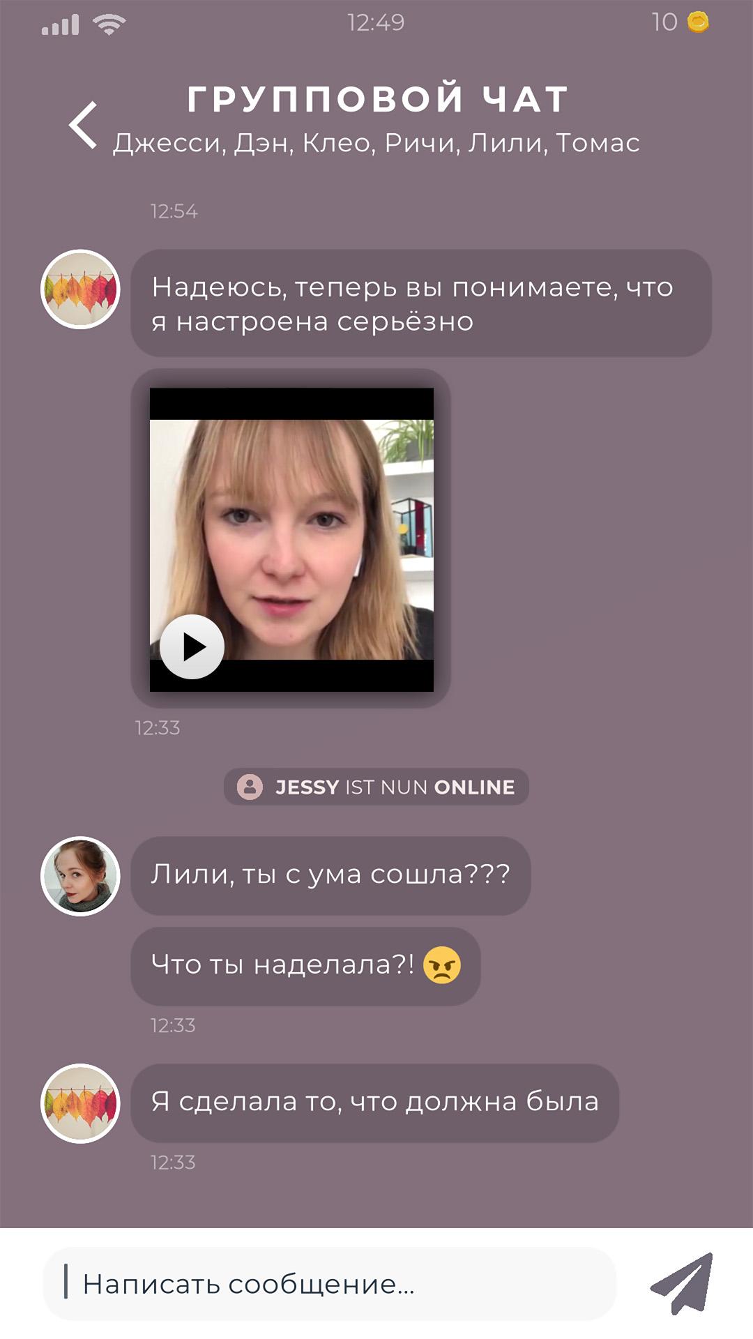 Весь процесс происходит на экране смартфона. Вы общаетесь с героями в групповом чате, а также личных диалогах, собирая информацию по крупицам.
