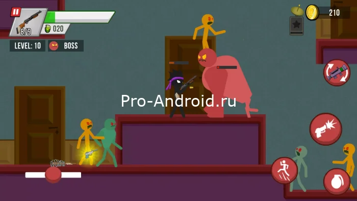 Прицеливание автоматическое: стикмен атакует ближайшую цель. Это упрощает бои в толпе, но иногда мешает выбрать приоритетного противника.