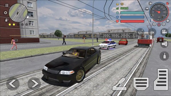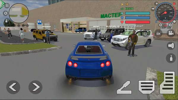 Схема меняется под ситуацию. Пешком — виртуальный джойстик слева, кнопки действий справа. За рулём — три варианта на выбор: руль, стрелки или акселерометр (наклоны устройства). Педали газа и тормоза всегда под рукой.