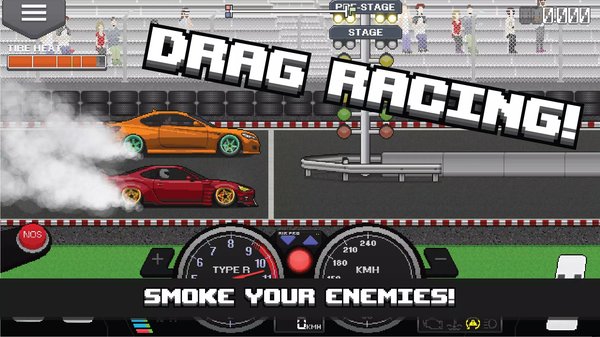 Pixel Car Racer — это олдскульные драг гонки в пиксельной графике, где главное не просто ездить, а собирать тачку по винтикам. Выбираете из 50 автомобилей, меняете движок, турбины, трансмиссию, резину и даже внутренности салона. Больше тысячи деталей для тюнинга — каждое решение влияет на скорость с управлением. Игровой процесс простой: прогреваете шины, жмёте газ в пол, переключаете передачи вручную, обгоняя соперников в спринте.