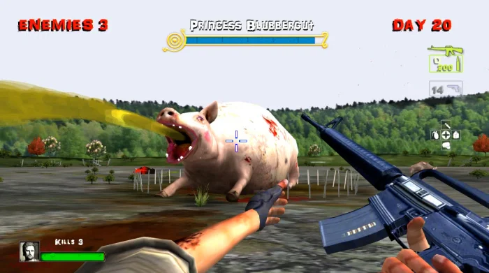Добро пожаловать на проклятую ферму, где хозяин прибит вилами к стене амбара. Виновник — его злой близнец из Канады. Теперь ваша работа — убивать мутантных свиней 100 дней подряд. Без зарплаты, зато с неограниченным доступом к оружию.