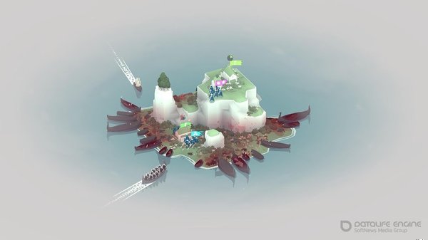- Каждый остров генерируется процедурно: уникальный рельеф, расположение домов, бухты, возвышенности. Холмы дают тактическое преимущество — копейщики на высоте сбрасывают атакующих вниз. Расщелины создают узкие проходы, где один отряд сдерживает толпу.