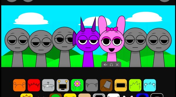 Всего 20 героев: Oren, Clukr, Gray, Garnold, Mr. Sun, Pinki, Jevin, Wenda, Black и другие. Каждый со своим голосом, тембром, характером. Можно заглушать отдельных участников, менять их местами, убирать и добавлять на ходу — трек меняется в реальном времени. Получается не столько игра, сколько мини-студия с мультяшной обёрткой.