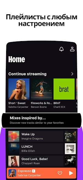При первом запуске выбираете десять любимых исполнителей — на основе ваших предпочтений алгоритм начинает строить подборку. Чем больше слушаете и ставите лайки, тем точнее результат. Центральная фишка — Flow: персонализированный бесконечный микс, который чередует знакомые песни с новинками. Есть варианты по настроению — для концентрации, вечеринки, расслабления, меланхолии. Похожие миксы подстраиваются автоматически — алгоритм умеет находить нужный жанр по вашему поведению.