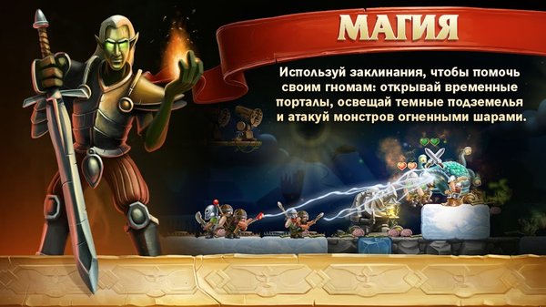 Гномам отдаёте приказы: выкопать блок, срубить дерево, собрать камень, атаковать врага. Сами они не бездельничают — выполняют задачи последовательно, расставляя приоритеты. С ростом опыта племя увеличивается: начинаете с одного подопечного, к середине прохождения — уже целый отряд. Каждого нужно кормить, одевать, вооружать.