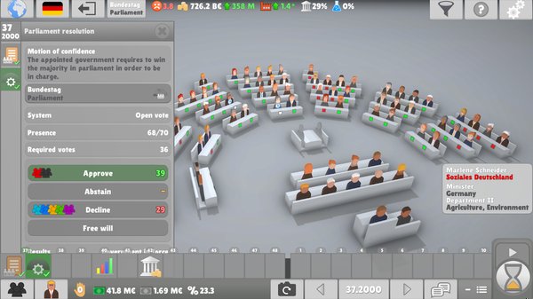 - Графика — намеренно минималистичная. 2D-аватары, цветовая кодировка по идеологиям, чистый интерфейс без лишнего. Всё заточено под информацию: карты голосования, списки законопроектов, рейтинги партий. На сенсорных экранах работает удобно.