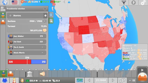 Выбираете страну — США, Великобританию, Францию, Германию, Южную Корею, десятки других. У каждой своя избирательная система: мажоритарная, пропорциональная по д'Ондту, смешанная. Электоральные карты Франции, UK, Штатов приближены к реальным — со своими оплотами консерваторов и либералов.