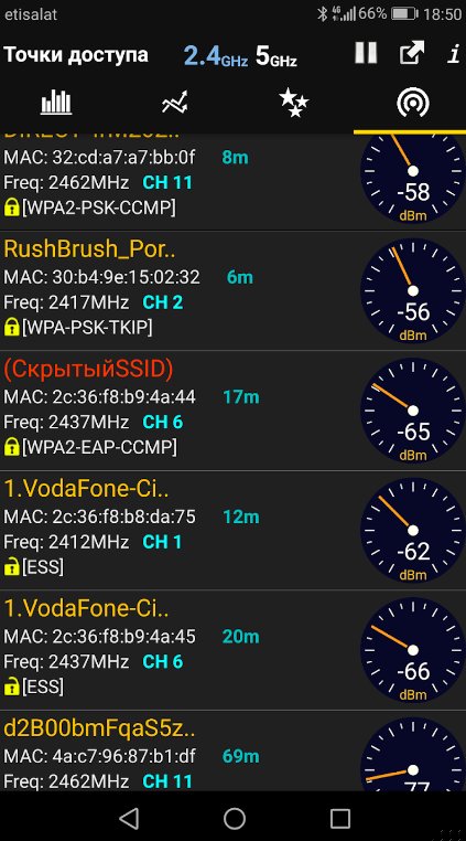 Сразу после запуска приложение сканирует эфир, показывая все точки доступа в радиусе действия антенны телефона. Для каждой сети — уровень сигнала в дБм, канал, ширина канала, MAC-адрес, тип шифрования с производителем роутера.