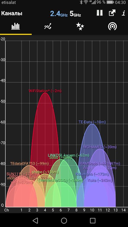 Главный экран — график каналов. По горизонтали каналы 1–13 (для 2.4 ГГц), по вертикали мощность сигнала. Видно сразу: какие каналы забиты соседскими роутерами, а какие свободны. Именно это нужно, чтобы правильно настроить свой.